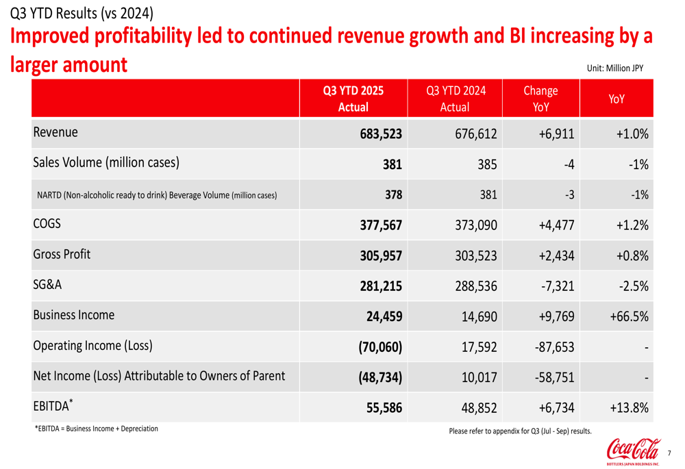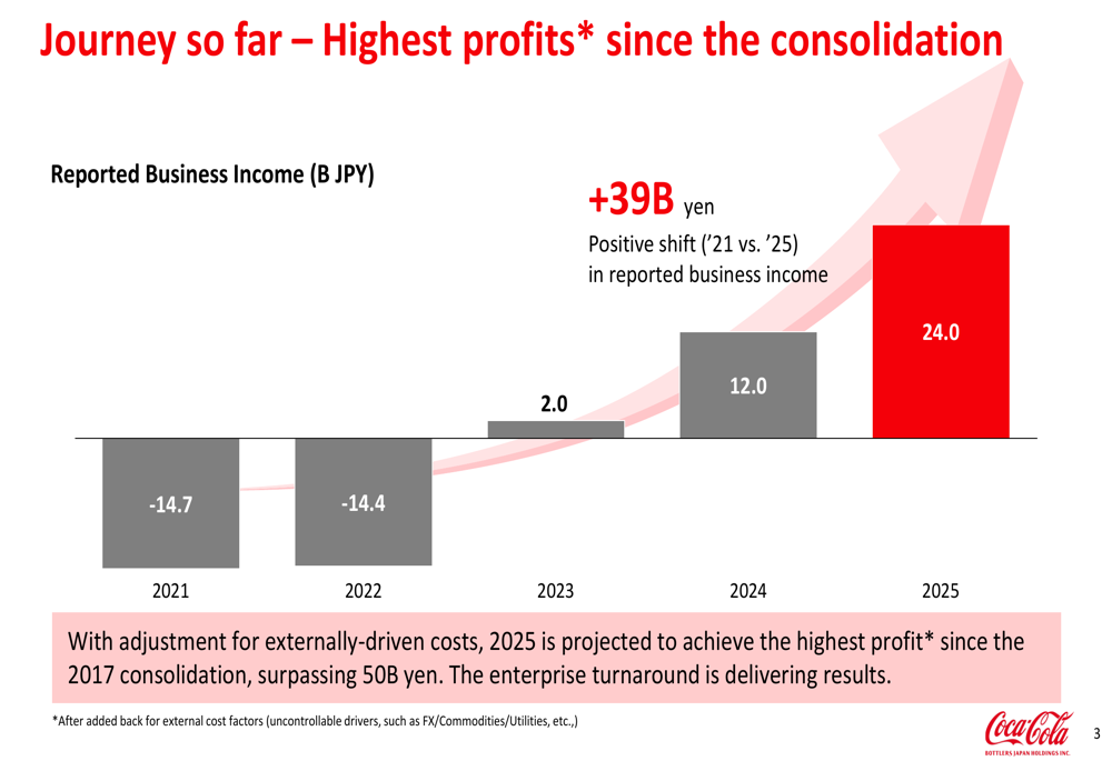 Coca-Cola Bottlers Japan Holdings Inc. (CCBJH) presented its Q3 2025 earnings on October 31, showcasing a remarkable financial turnaround driven by strategic pricing initiatives and transformation efforts. The company has successfully shifted from consecutive years of losses to achieving its highest profits since the 2017 consolidation.