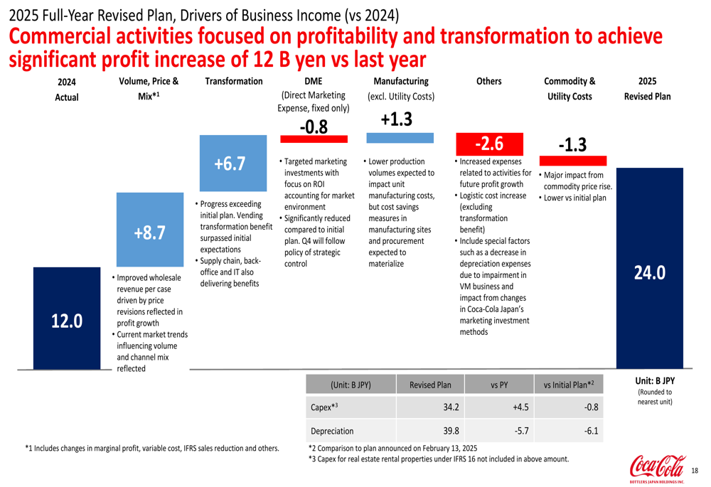 Volume, price, and mix factors are projected to add ¥8.7 billion to the full-year business income, while transformation initiatives are expected to contribute ¥6.7 billion. These positive drivers significantly outweigh the negative impacts from commodity and utility costs (¥1.3 billion), direct marketing expenses (¥0.8 billion), and other factors (¥2.6 billion).