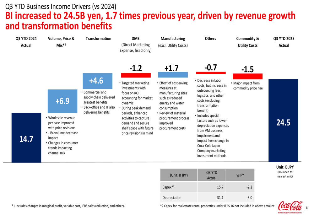 Volume, price, and mix factors contributed ¥6.9 billion to business income, while transformation initiatives added another ¥4.6 billion. These positive factors more than offset negative impacts from increased direct marketing expenses, commodity and utility costs, and other factors.