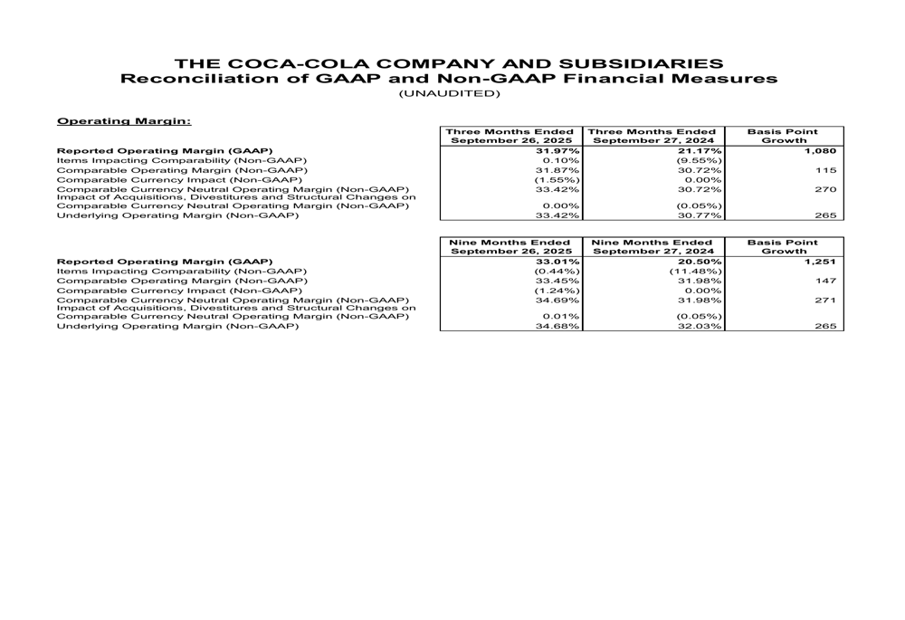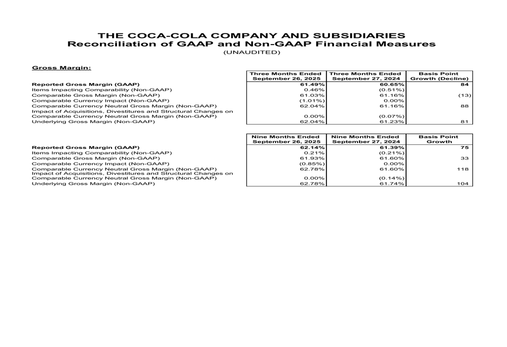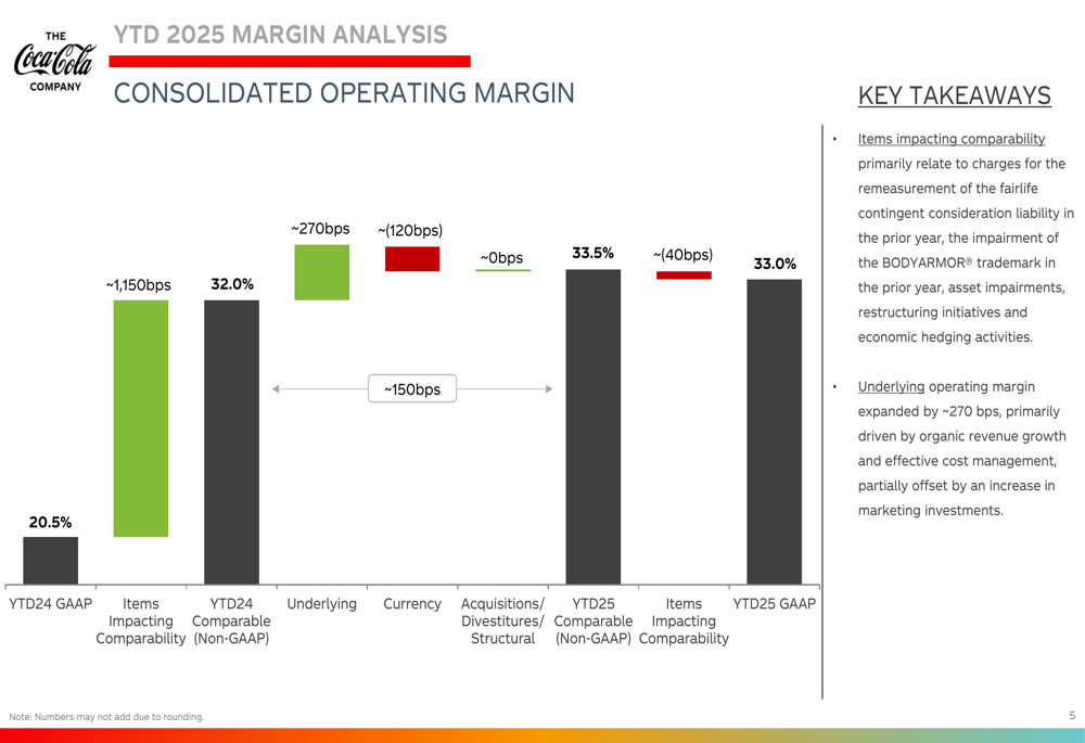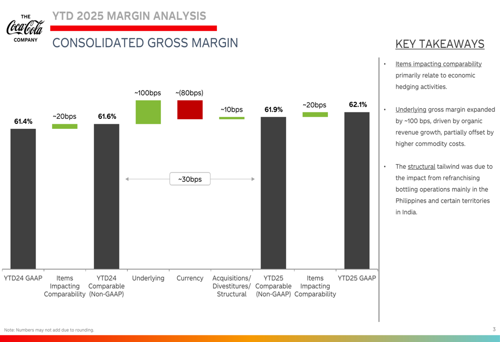 Coca-Cola’s Q3 2025 presentation emphasized substantial margin expansion across both gross and operating metrics. The company’s gross margin increased from 60.7% in Q3 2024 to 61.5% in Q3 2025 on a GAAP basis, while operating margin saw a dramatic improvement from 21.2% to 32.0% during the same period.
