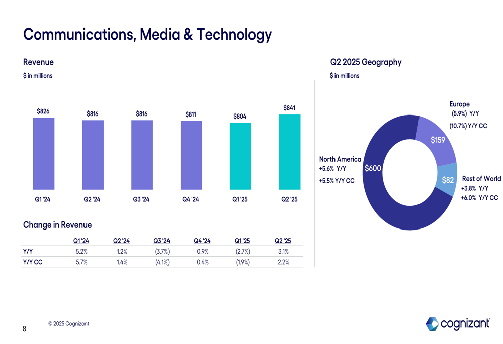 Communications, Media & Technology, the company’s smallest segment, generated $841 million in revenue, growing 3.1% year-over-year (2.2% in constant currency). North American operations showed 5.6% growth, while European operations declined by 5.9%.