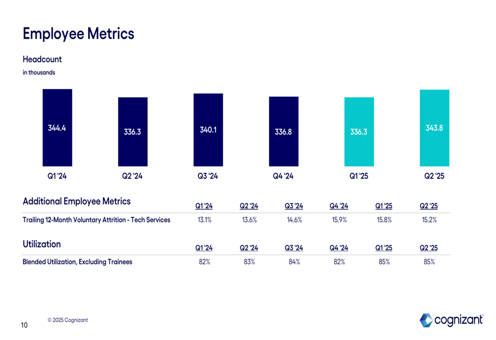 On the workforce front, Cognizant’s headcount increased to 343,800 employees, up from 336,300 in Q2 2024. Voluntary attrition in technical services stood at 15.2%, slightly higher than the 13.6% reported in the year-ago quarter. The company maintained a high blended utilization rate of 85%, excluding trainees, indicating efficient resource management.