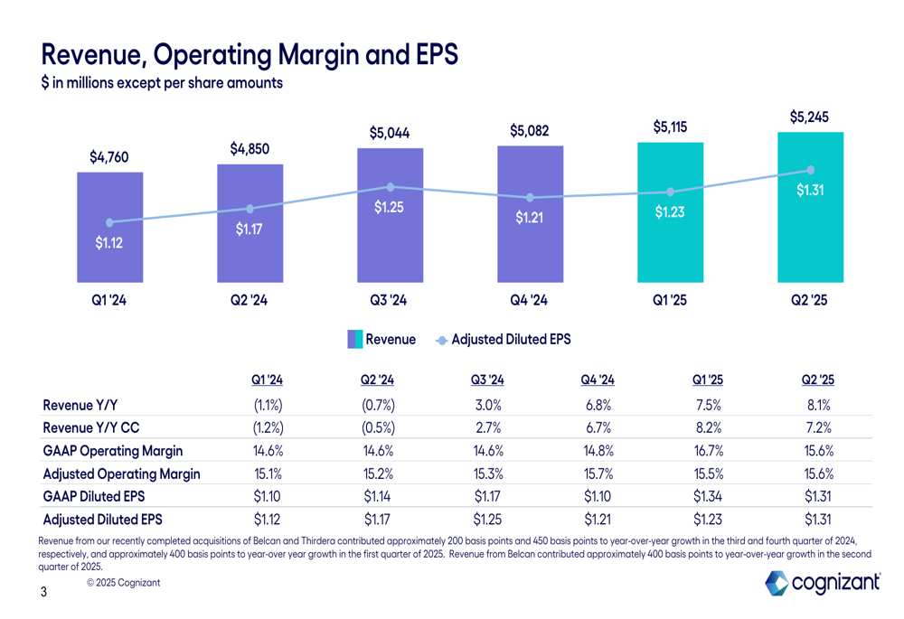 Cognizant reported Q2 2025 revenue of $5.25 billion, representing an 8.1% year-over-year increase (7.2% in constant currency). The company’s operating margins showed improvement, with GAAP operating margin rising to 15.6% from 14.6% in the year-ago quarter. Adjusted operating margin also increased to 15.6% from 15.2% in Q2 2024.