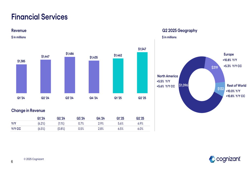 Financial Services, Cognizant’s largest segment, posted revenue of $1.55 billion, up 6.9% year-over-year (6.0% in constant currency). All geographic regions showed growth, with Europe leading at 10.8% year-over-year.
