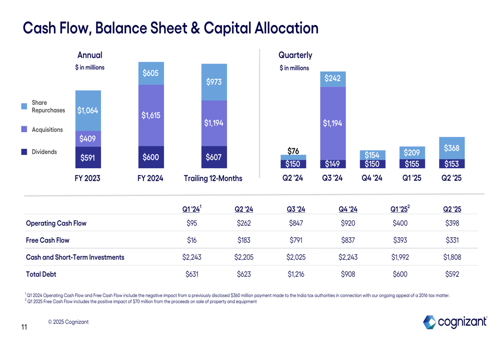 Cognizant continued its shareholder-friendly capital allocation strategy, with significant investments in share repurchases, acquisitions, and dividends. The company’s balance sheet remains strong, with $1.81 billion in cash and short-term investments as of June 30, 2025.