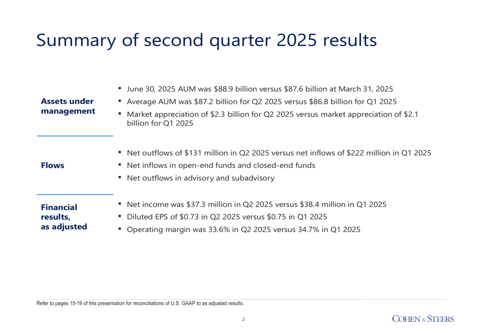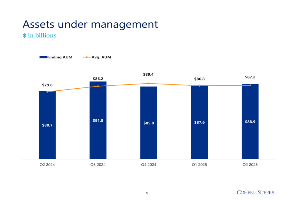 As shown in the following summary of second quarter results, the company’s AUM increased to $88.9 billion as of June 30, 2025, up from $87.6 billion at the end of March: