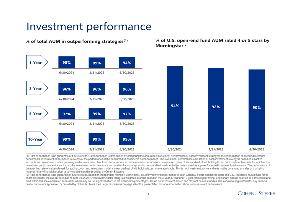 Cohen & Steers is also expanding its product offerings, having launched its first active ETFs in the quarter, which recorded $54 million in net inflows. The company plans to launch additional active ETFs and continues to explore strategic combinations in infrastructure and real estate.