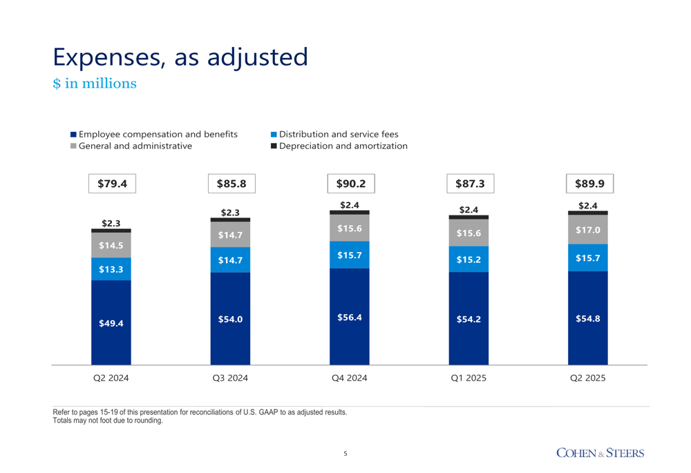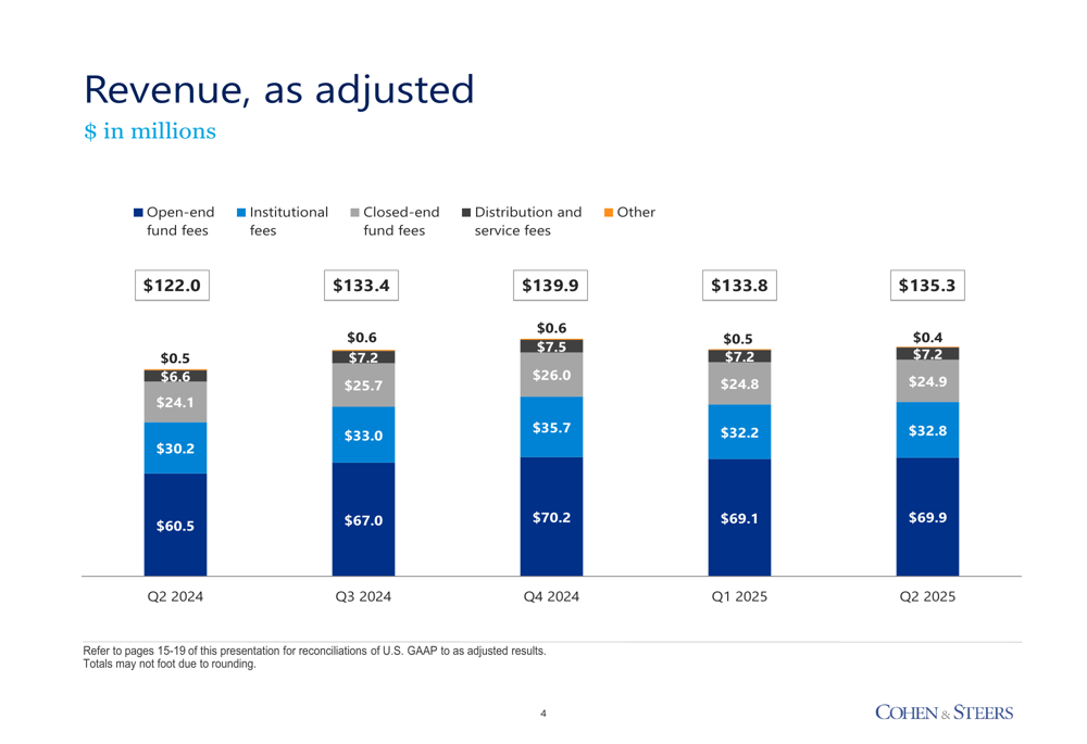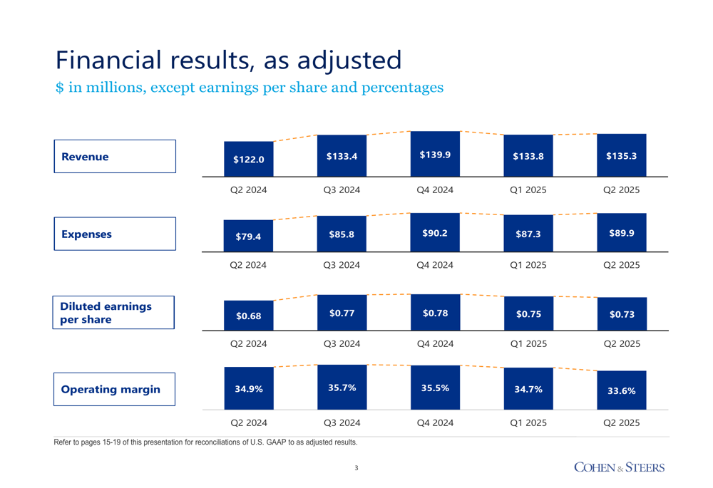 Cohen & Steers reported adjusted earnings per share of $0.73 for Q2 2025, down from $0.75 in the previous quarter. Revenue increased 1.1% quarter-over-quarter to $135.3 million, while adjusted operating income declined to $45.4 million, resulting in an operating margin of 33.6%, down from 34.7% in Q1 2025.