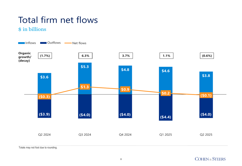 The shift to net outflows in Q2 2025 represents a reversal from recent quarters. Total firm net outflows were $131 million, compared to net inflows of $222 million in Q1 2025, resulting in an organic decay rate of 0.6%.