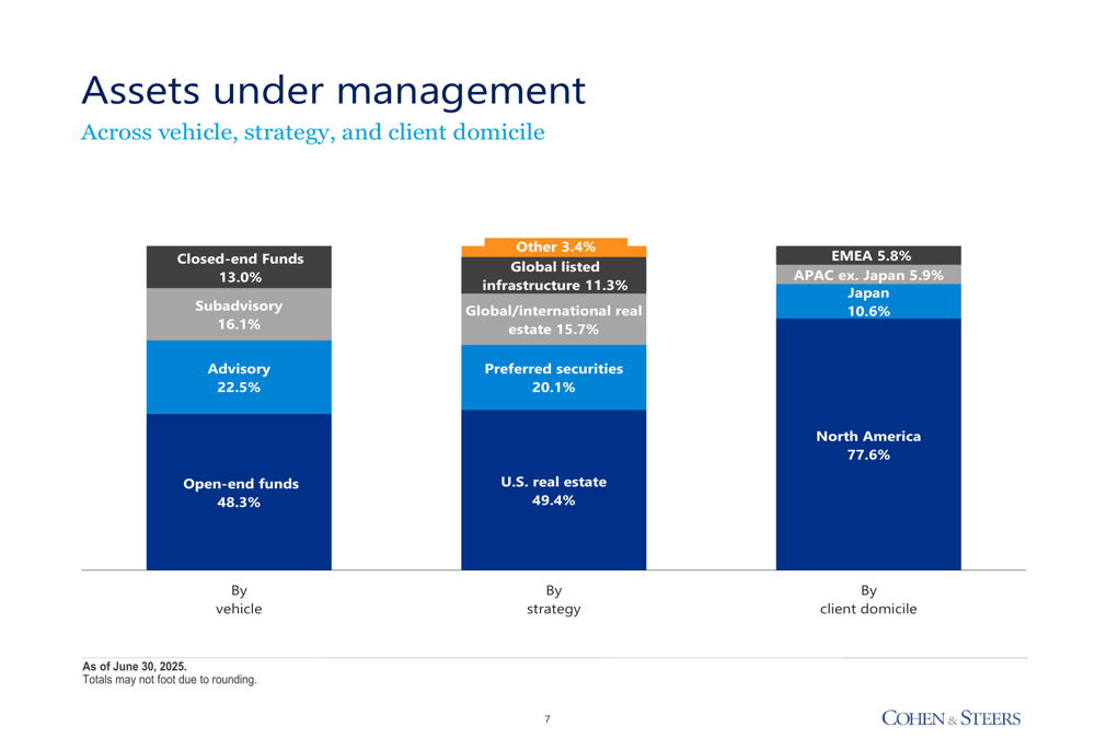 The company maintains a diverse mix of investment vehicles, strategies, and client locations. As of June 30, 2025, open-end funds represented the largest portion of AUM at 48.3%, followed by advisory accounts at 22.5%, subadvisory at 16.1%, and closed-end funds at 13.0%.