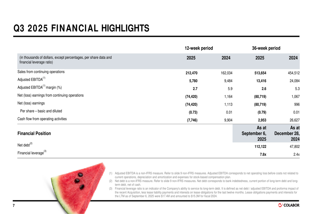 Colabor, Quebec’s largest food service operator, reported a 31.1% increase in consolidated sales to $212.5 million for Q3 2025, compared to $162.0 million in the same period last year. However, this growth was overshadowed by a net loss of $74.4 million or $0.73 per share, a dramatic reversal from the $1.1 million profit reported in Q3 2024.