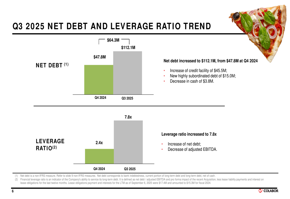 Colabor’s debt position deteriorated significantly during the quarter. Net debt increased to $112.1 million from $47.8 million at the end of Q4 2024, representing an increase of more than 134%. This was driven by a $45.5 million increase in the credit facility and $15.0 million in new highly subordinated debt. Consequently, the leverage ratio jumped to 7.8x from 2.4x previously.