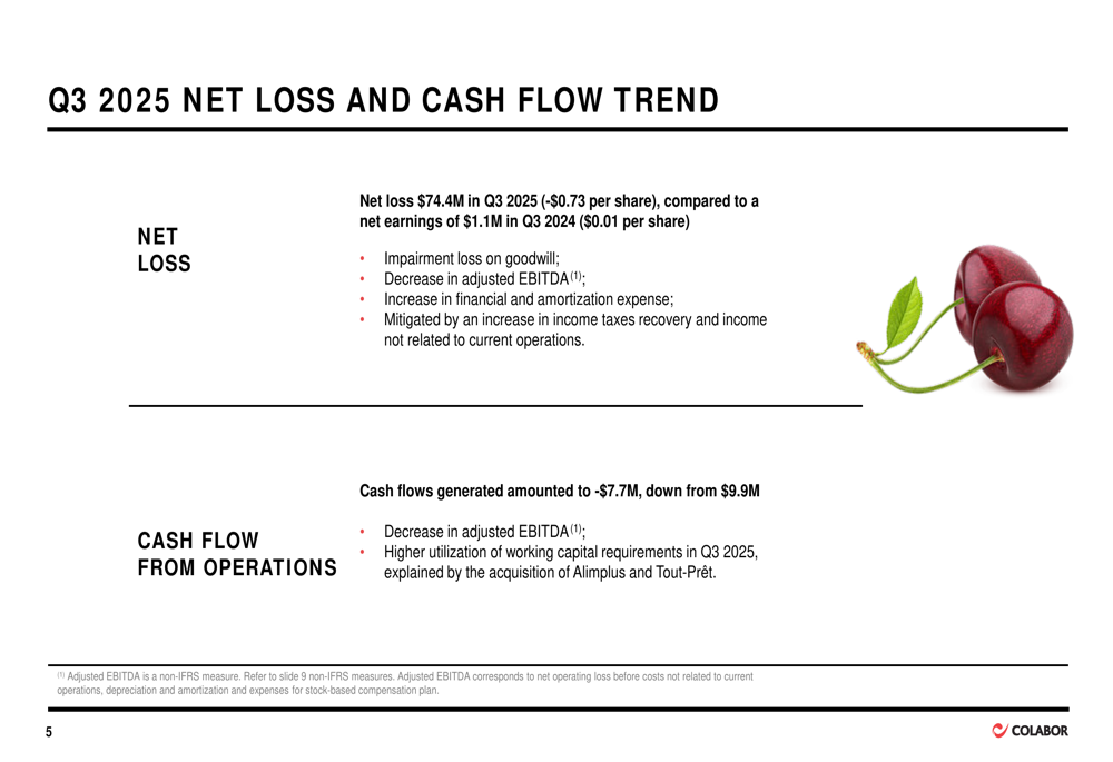 The substantial net loss of $74.4 million was primarily driven by an impairment loss on goodwill, decreased adjusted EBITDA, and increased financial and amortization expenses. Cash flow from operations turned negative at -$7.7 million, compared to a positive $9.9 million in Q3 2024, reflecting both the lower profitability and higher working capital utilization following recent acquisitions.