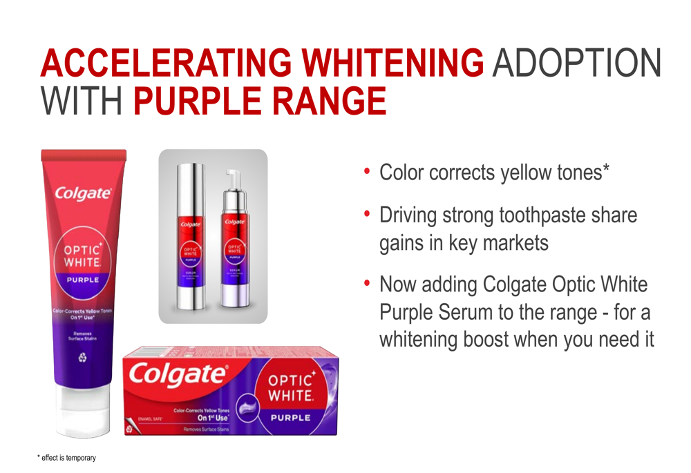 Colgate-Palmolive is also accelerating whitening adoption with its Purple Range, which offers whitening capability and stain removal with an enamel-safe coating: