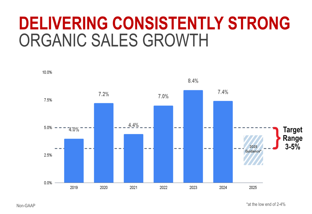 The company has maintained a consistent track record of organic sales growth over recent years, as illustrated in the following chart: