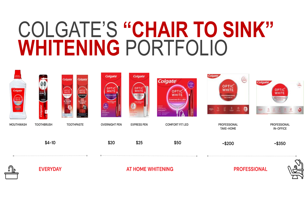 In the oral care segment, the company highlighted its comprehensive whitening portfolio, which spans from everyday products priced at $4-10 to professional in-office solutions at around $350, demonstrating the company’s range and premium positioning strategy: