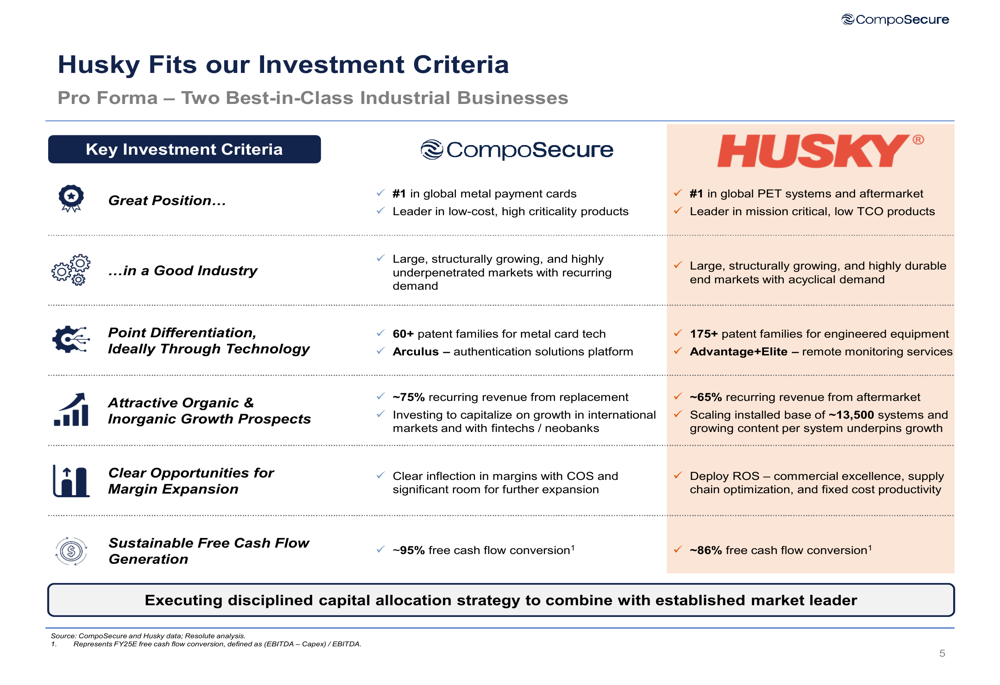 The most significant strategic announcement was CompoSecure’s planned acquisition of Husky Technologies for approximately $5.0 billion. Husky is described as a market-leading manufacturer of engineered equipment and aftermarket services, with approximately $1.58 billion in revenue and $400 million in Net Adjusted EBITDA, representing a 25% margin.