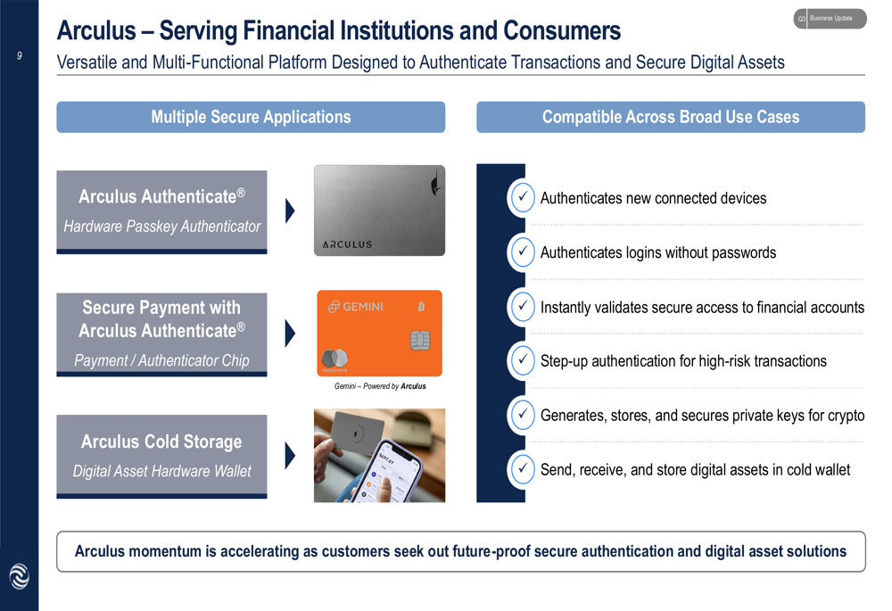 CompoSecure is also expanding beyond traditional payment cards with its Arculus platform, which provides authentication solutions for financial institutions and consumers. The platform includes hardware passkey authenticators, secure payment solutions, and digital asset hardware wallets, positioning the company in the growing digital security market.