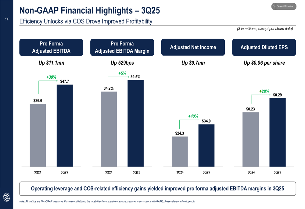 Profitability metrics showed even more impressive gains, with Pro Forma Adjusted EBITDA reaching $47.7 million, up 30% year-over-year. The company’s gross margin expanded significantly to 59.0%, representing a 730 basis point improvement from the prior year period. EBITDA margin also improved substantially, increasing by 529 basis points to 39.5%.