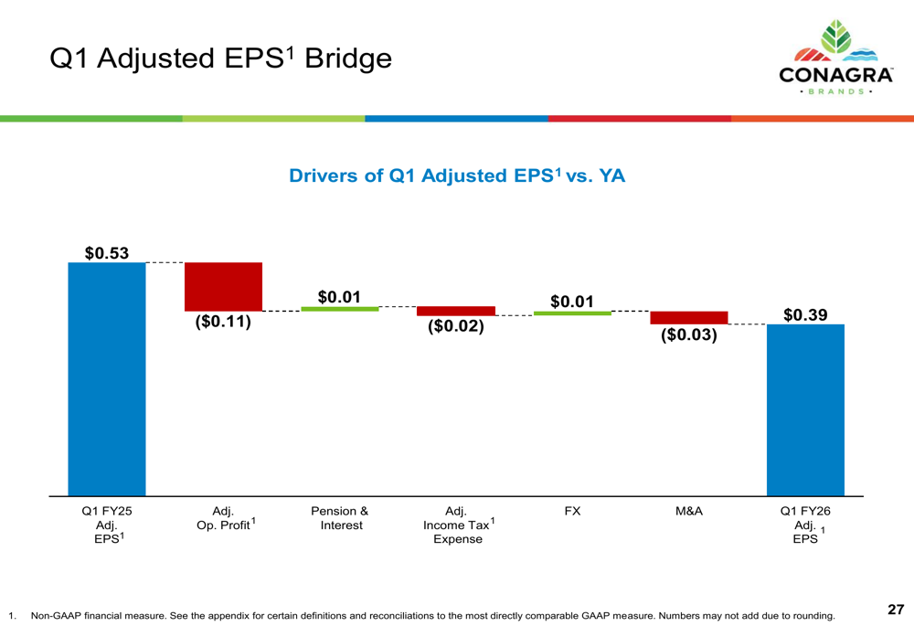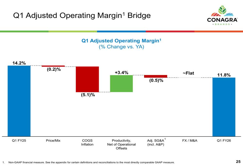 Conagra reported Q1 FY26 organic net sales of $2,611 million, representing a 0.6% decline compared to the previous year. The company’s adjusted operating margin was 11.8%, down 244 basis points year-over-year, while adjusted EPS came in at $0.39, a 26.4% decrease from Q1 FY25.
