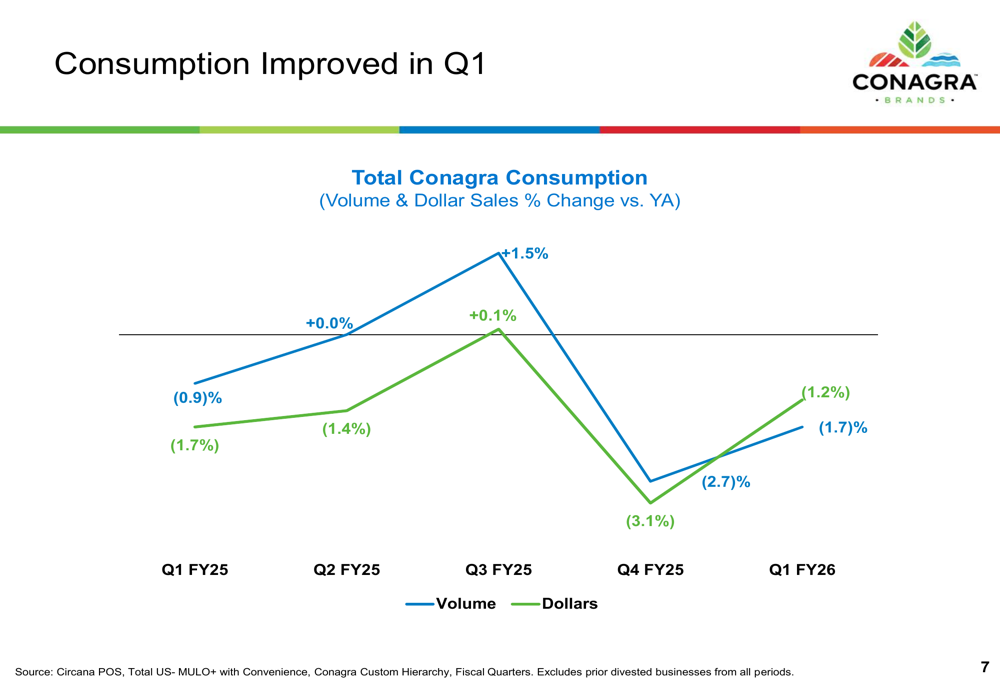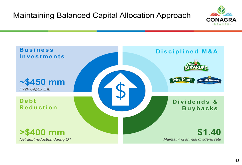 Conagra continued to execute on its portfolio optimization strategy, completing the divestitures of Chef Boyardee, Van de Kamp’s, and Mrs. Paul’s brands during the quarter. The proceeds from these transactions contributed to a reduction in net debt from $8.0 billion in Q4 FY25 to $7.6 billion in Q1 FY26.