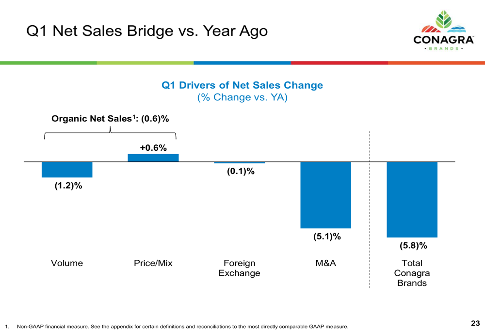 Conagra reported modest improvement in consumption trends compared to the previous quarter. As shown in the following chart of volume and dollar sales changes, the company’s performance recovered from the supply-challenged fourth quarter: