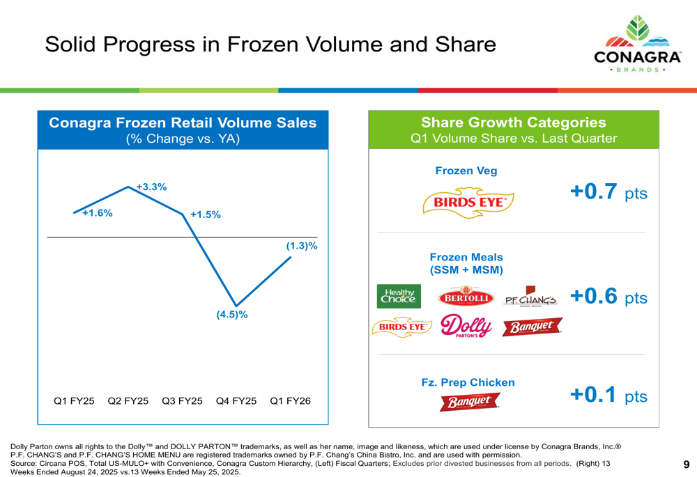 Frozen retail volume sales improved from -4.5% in Q4 FY25 to -1.3% in Q1 FY26. The company also gained market share in several important frozen categories, including frozen vegetables (+0.7 points), frozen meals (+0.6 points), and frozen prepared chicken (+0.1 points).