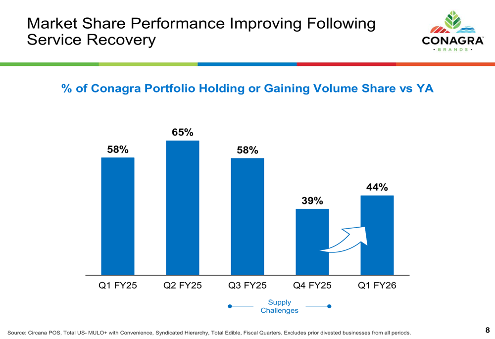 The percentage of Conagra’s portfolio holding or gaining volume share increased to 44% in Q1 FY26, up from 39% in Q4 FY25, though still below the 58-65% range seen in earlier quarters.