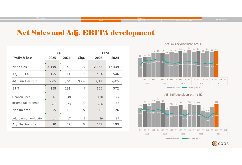 COOR reported net sales of SEK 3,199 million for Q2 2025, a slight increase from SEK 3,180 million in the same period last year. More significantly, the company achieved organic growth of 3%, reversing the negative trend from previous quarters (-1% in Q2 2024). Adjusted EBITA reached SEK 165 million with a margin of 5.2%, showing a modest improvement from 5.1% in Q2 2024.