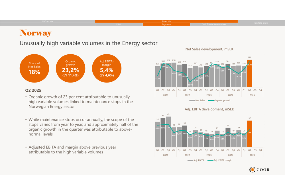 The standout performer was Norway, which accounts for 18% of net sales. The Norwegian segment achieved remarkable organic growth of 23.2%, significantly up from 11.4% in Q2 2024. This exceptional performance was attributed to unusually high variable volumes linked to maintenance stops in the Norwegian energy sector. The adjusted EBITA margin in Norway improved to 5.4% from 4.6% in the previous year.