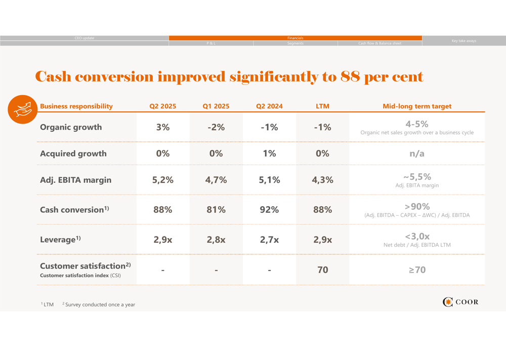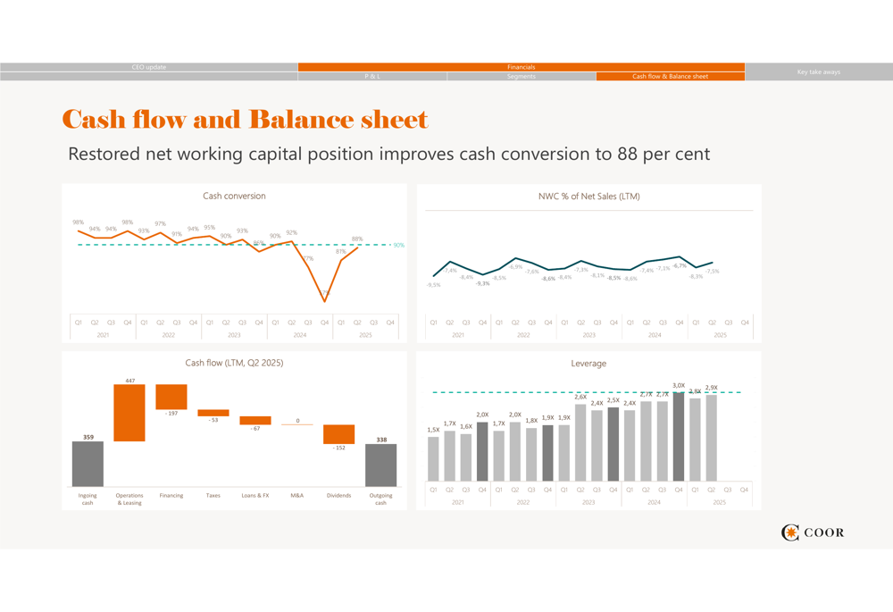 A significant highlight of the quarter was the improvement in cash conversion to 88%, up from 81% in Q1 2025, though still below the 92% achieved in Q2 2024. This improvement was attributed to a restored net working capital position. The company’s leverage ratio stood at 2.9x, slightly higher than the 2.7x reported in Q2 2024.