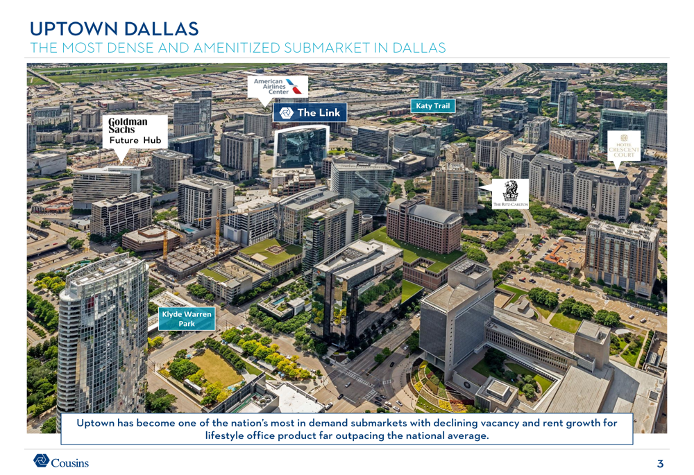 The Link represents a significant addition to Cousins’ portfolio, featuring modern amenities and strong occupancy metrics that exceed the company’s current portfolio average. The 25-story lifestyle office tower spans 292,000 square feet and was completed in 2021, making it one of the newest office properties in the Uptown Dallas submarket.