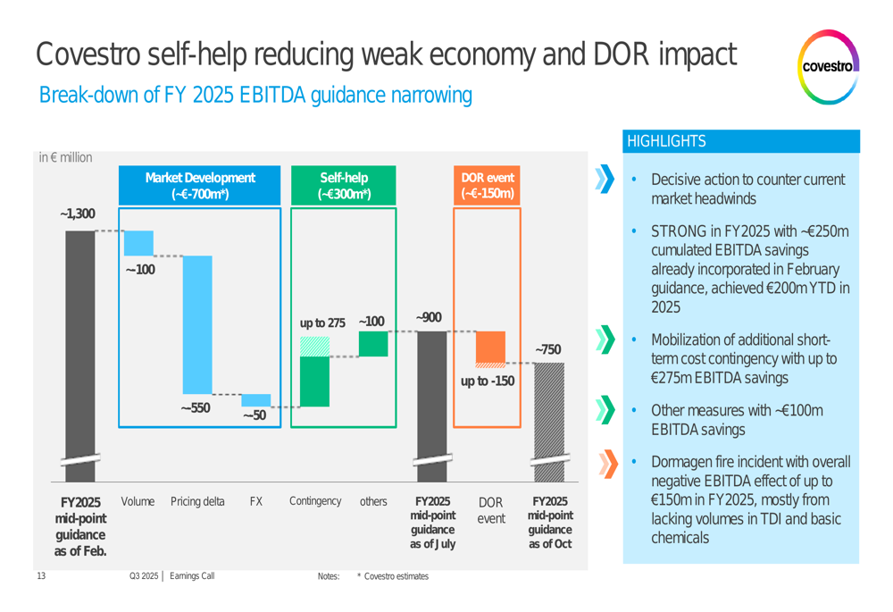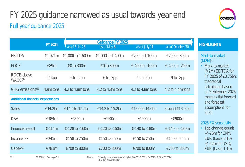 Covestro has narrowed its full-year 2025 guidance, reflecting both ongoing challenges and the impact of its cost-saving initiatives. The company now expects: