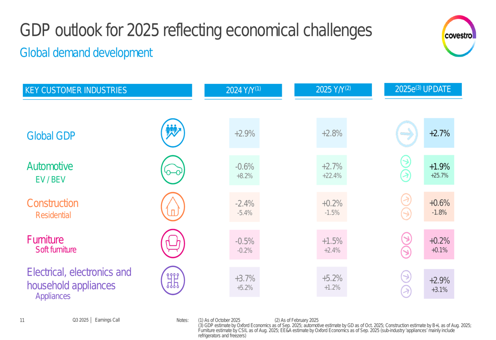 Looking ahead, Covestro faces a mixed economic outlook across its key customer industries. While global GDP is projected to grow by 2.7% in 2025, construction and furniture markets remain sluggish with expected growth rates of 0.6% and 0.2% respectively.