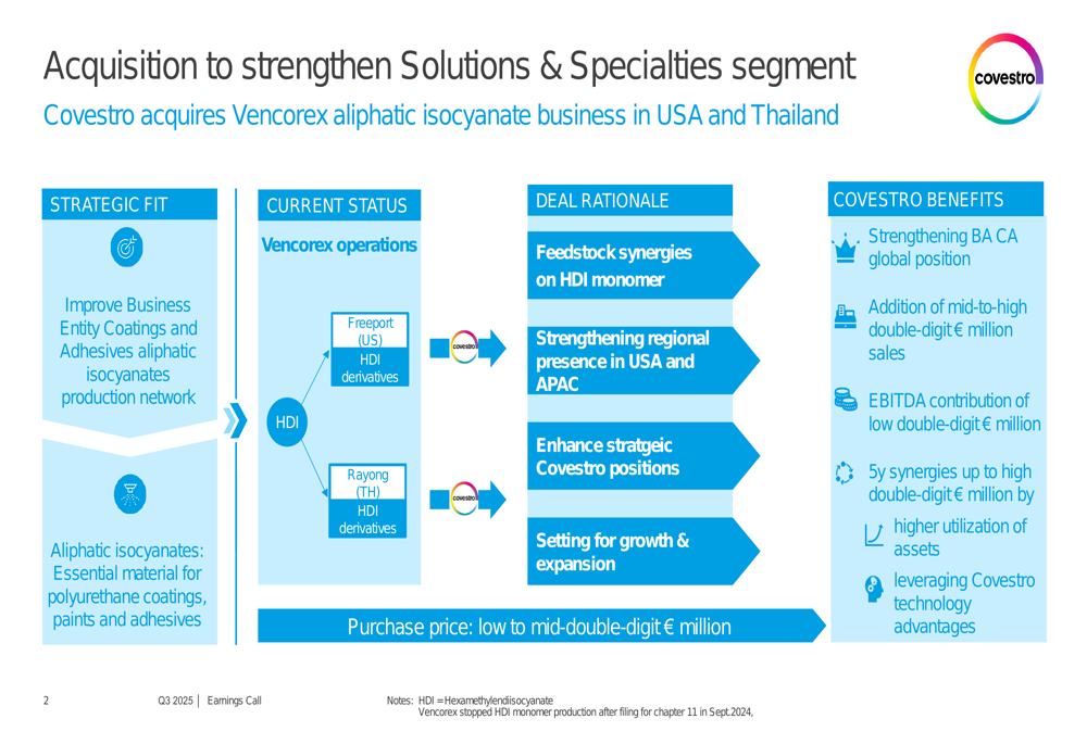 Despite market challenges, Covestro continues to pursue strategic growth opportunities. The company announced the acquisition of Vencorex’s aliphatic isocyanate business in the USA and Thailand, which is expected to strengthen its Solutions & Specialties segment.
