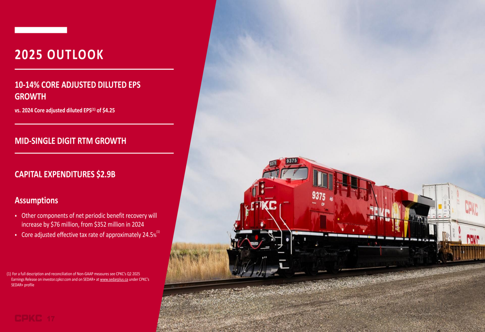 CPKC maintained its 2025 outlook, projecting 10-14% core adjusted diluted EPS growth compared to the 2024 core adjusted diluted EPS of $4.25. The company expects mid-single-digit RTM growth for the year, with capital expenditures of $2.9 billion.