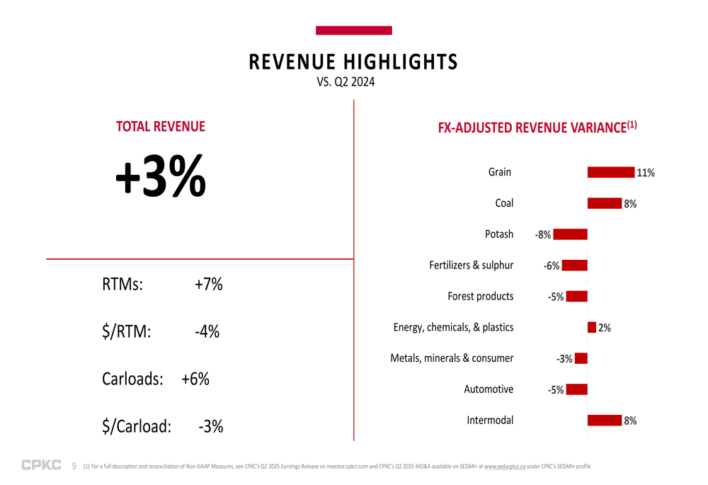 CPKC’s revenue performance varied significantly across commodity groups. The strongest performers were Grain (+11%), Coal (+8%), and Intermodal (+8%), which helped offset weakness in Potash (-8%), Fertilizers & Sulphur (-6%), Forest Products (-5%), and Automotive (-5%).