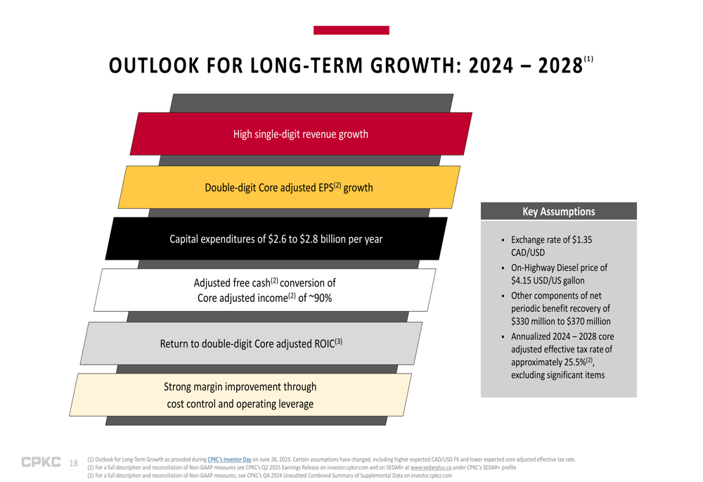 Looking further ahead, CPKC outlined its long-term growth expectations for 2024-2028, including high single-digit revenue growth, double-digit core adjusted EPS growth, and a return to double-digit core adjusted return on invested capital (ROIC). The company expects capital expenditures of $2.6 to $2.8 billion per year and adjusted free cash conversion of core adjusted income of approximately 90%.