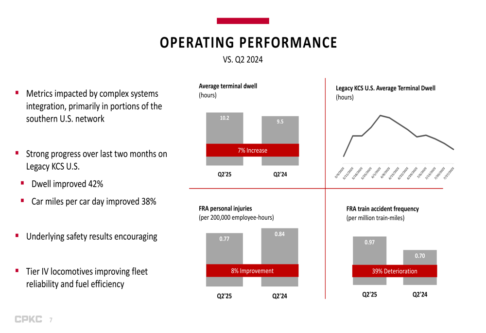 CPKC acknowledged operational challenges related to complex systems integration, primarily in portions of the southern U.S. network. Despite these challenges, the company reported strong progress over the last two months on the Legacy KCS U.S. operations, with dwell time improving 42% and car miles per car day improving 38%.