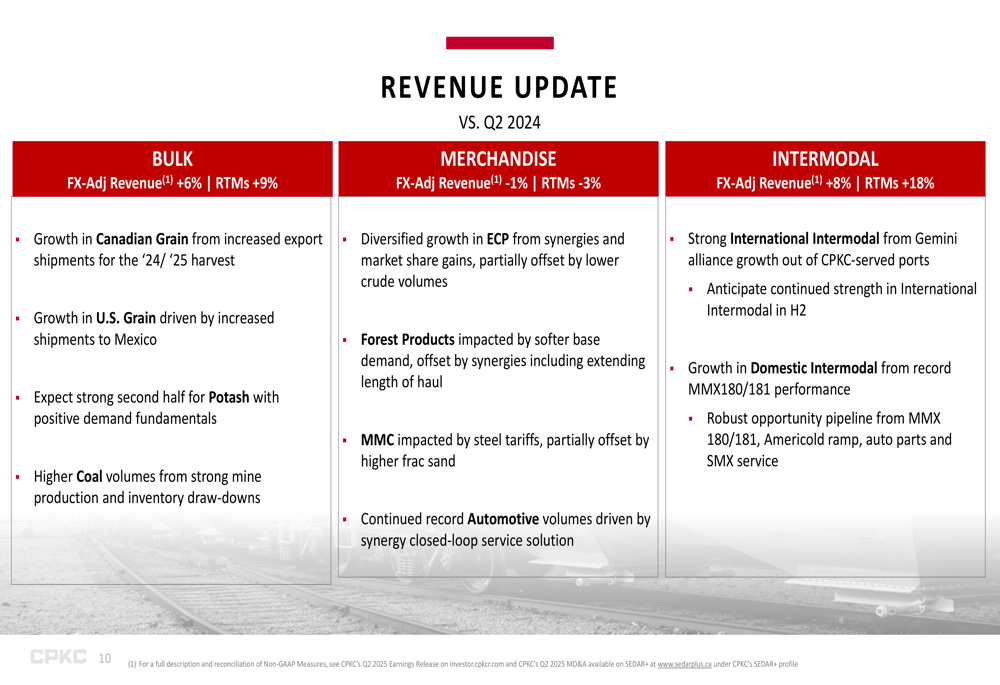 In the Bulk segment, which saw FX-adjusted revenue growth of 6% and RTM growth of 9%, Canadian Grain benefited from increased export shipments for the 2024/2025 harvest, while U.S. Grain was driven by increased shipments to Mexico. Coal volumes increased due to strong mine production and inventory draw-downs.