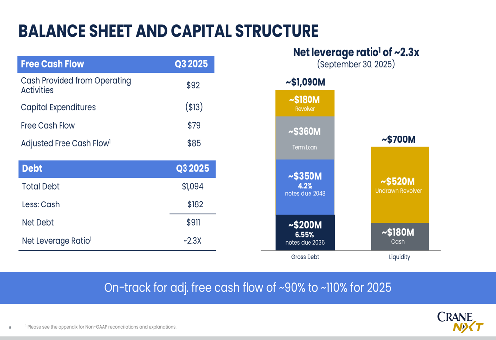 Crane NXT maintained a solid balance sheet with $182 million in cash and $1,094 million in total debt as of September 30, 2025, resulting in a net debt of $911 million and a net leverage ratio of approximately 2.3x. This financial position provides flexibility for future strategic investments and shareholder returns.