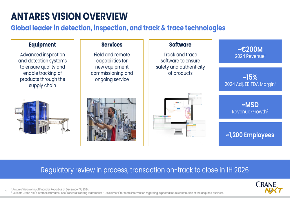 A key highlight from the presentation was Crane NXT’s announcement of its agreement to acquire Antares Vision, a global leader in detection, inspection, and track & trace technologies. This strategic acquisition, expected to close in the first half of 2026, will expand Crane NXT’s technology solutions into the life sciences and food & beverage markets.