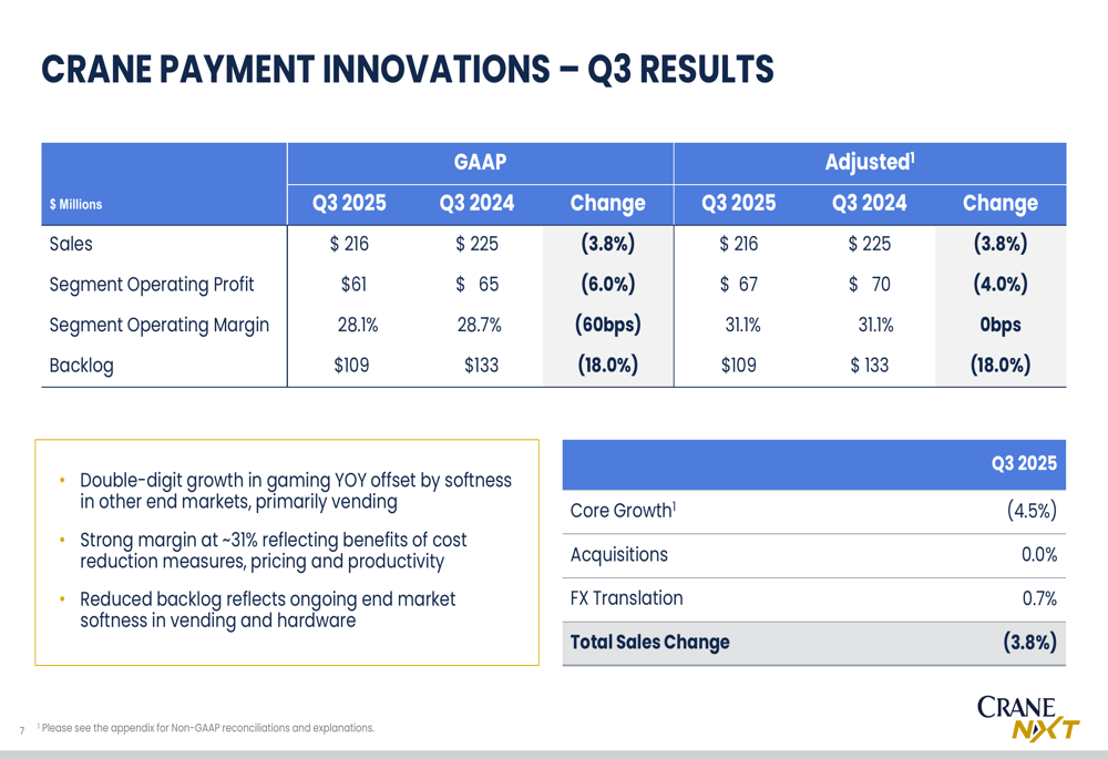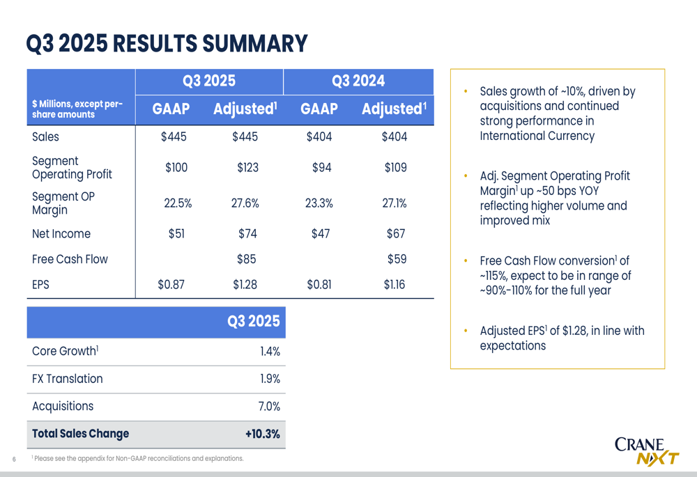 Crane NXT reported Q3 2025 sales of $445 million, representing 10.3% growth when accounting for core growth, foreign exchange impacts, and acquisitions. The company achieved an adjusted segment operating profit margin of 27.6%, up approximately 50 basis points year-over-year, reflecting higher volume and improved mix.