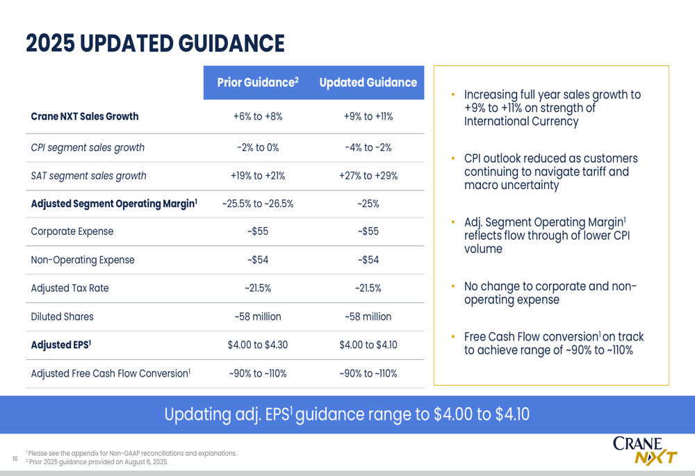 Crane NXT updated its full-year 2025 guidance, increasing its sales growth projection to 9-11% from the previous 6-8%, primarily driven by strength in International Currency. However, the company reduced its CPI segment sales growth outlook to -4% to -2% (from -2% to 0%) as customers continue to navigate tariff and macroeconomic uncertainties.