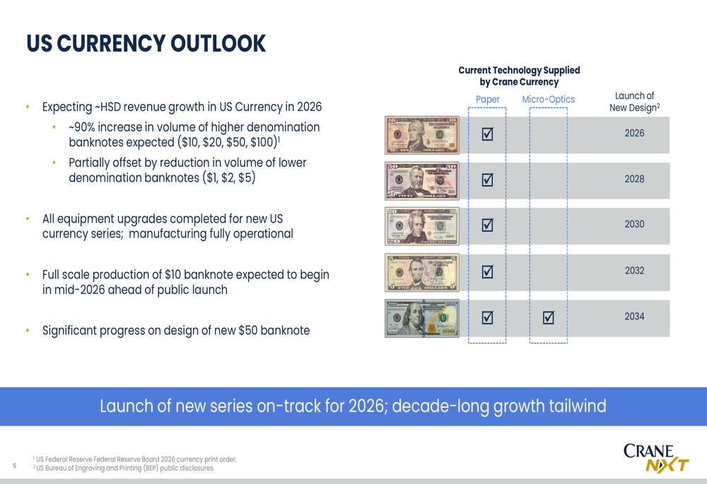Another significant growth driver highlighted in the presentation is the upcoming launch of a new US currency series. Crane NXT expects high-single-digit revenue growth in its US Currency business in 2026, driven by a 90% increase in volume for higher denomination banknotes ($10, $20, $50, $100). The company has completed all equipment upgrades for the new series and expects full-scale production of the $10 banknote to begin in mid-2026.