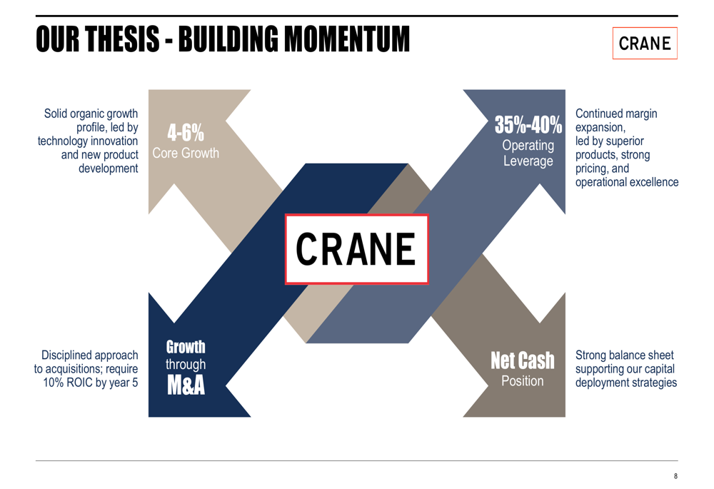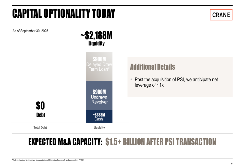 Crane maintains an exceptionally strong financial position with approximately $2,188 million in liquidity and zero debt. This capital optionality provides significant flexibility for strategic investments and acquisitions.