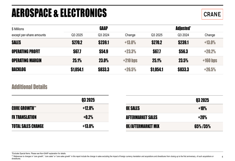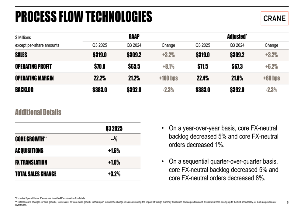 Crane delivered impressive year-over-year growth across key financial metrics in Q3 2025. Sales increased 7.5% to $589.2 million, driven by core growth of 5.6%, acquisition contribution of 0.9%, and favorable foreign exchange impact of 1.0%.