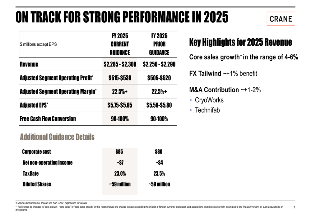 Based on strong year-to-date performance, Crane has raised its full-year 2025 guidance across key metrics. The company now expects revenue between $2,285-$2,300 million, up from previous guidance of $2,250-$2,290 million.