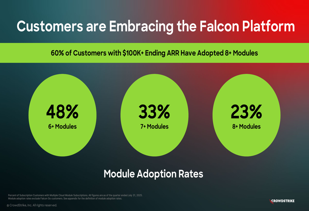 CrowdStrike’s platform strategy continues to gain traction, with 60% of customers having $100K+ in ARR adopting 8 or more modules. This demonstrates the company’s success in expanding beyond its core endpoint security offerings.
