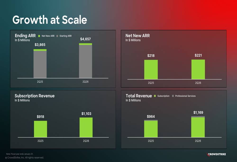 CrowdStrike delivered robust financial results for Q2 FY2026, with total revenue reaching $1.17 billion, up 21% year-over-year. The company reported record Q2 net new annual recurring revenue (ARR) of $221 million, bringing total ending ARR to $4.66 billion, representing 20% year-over-year growth.